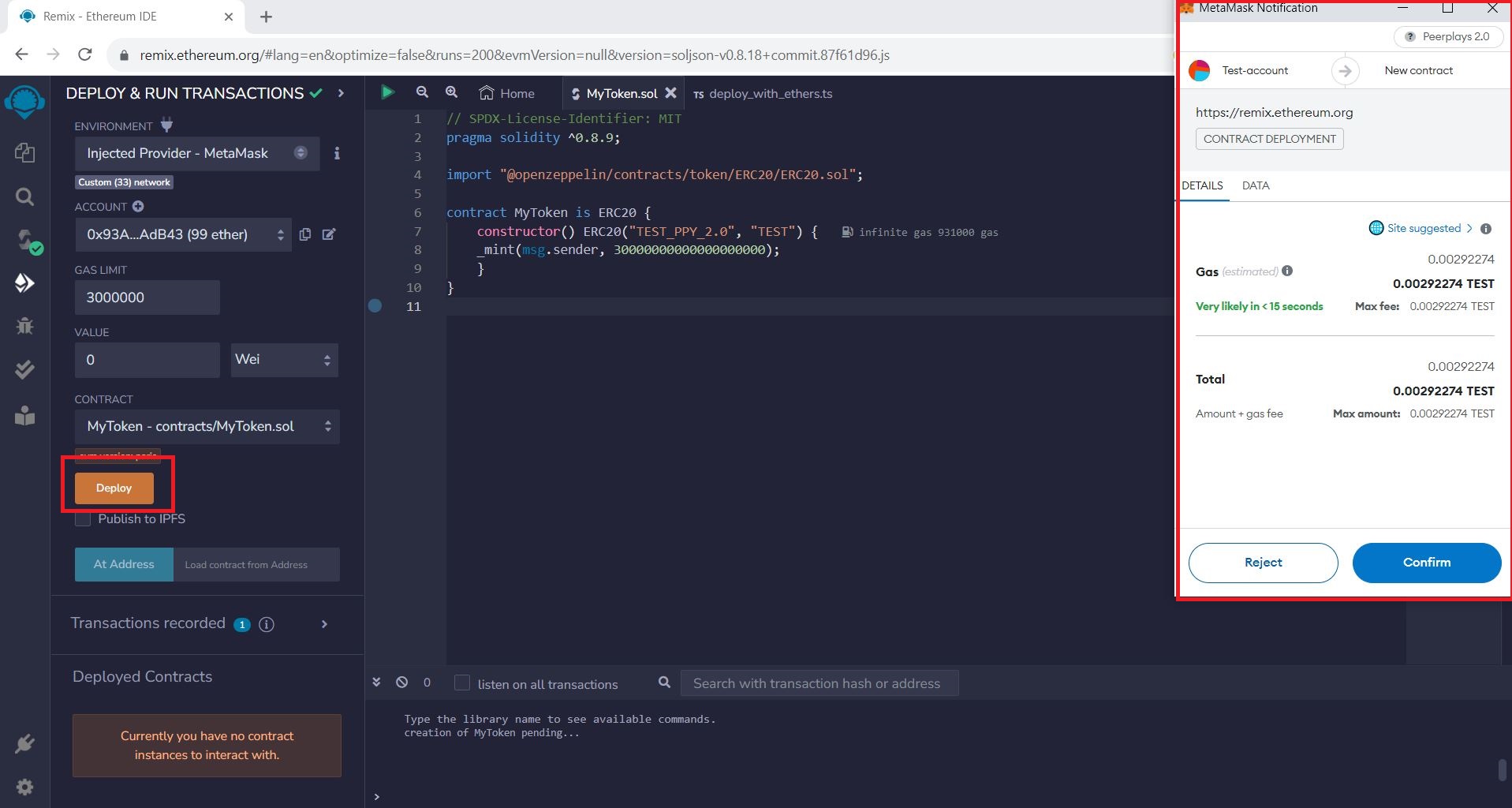 B) Click on **Deploy**, the MetaMask window will be prompted to complete the transaction. Click on **confirm** to finish the contract deployment.&#x20;