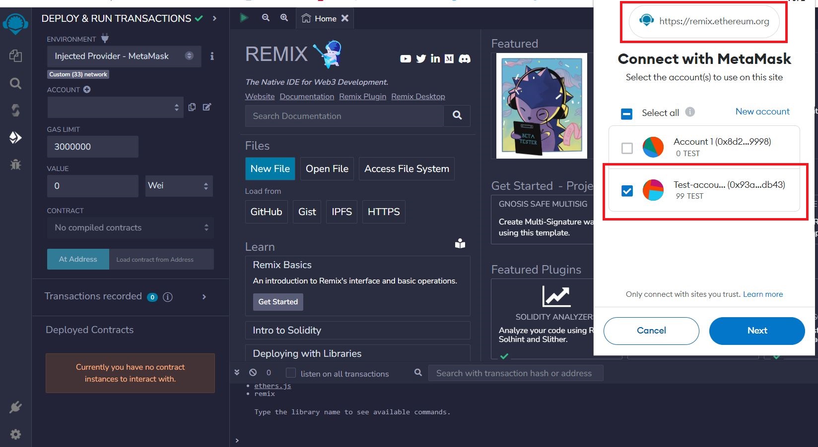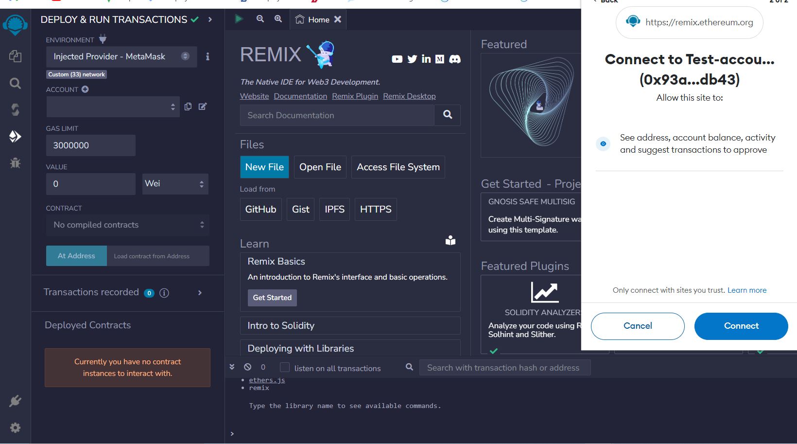 <figure><img src="https://809720161-files.gitbook.io/~/files/v0/b/gitbook-x-prod.appspot.com/o/spaces%2FPPsAwLpyOeItHVo4Fslw%2Fuploads%2F1ZkkvYPzqOlBINqhma1i%2FRemix-metamask-connected.JPG?alt=media&#x26;token=923ee797-f5fd-4d4f-b6d4-6aeb874964cb" alt=""><figcaption></figcaption></figure>