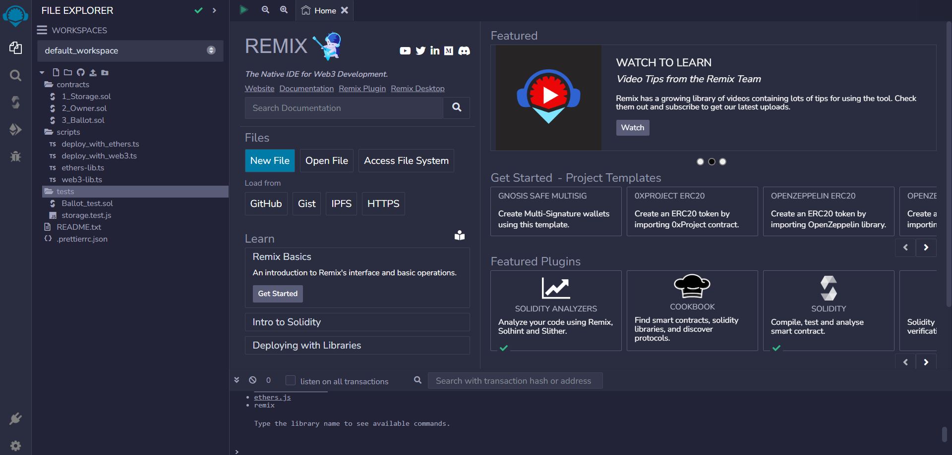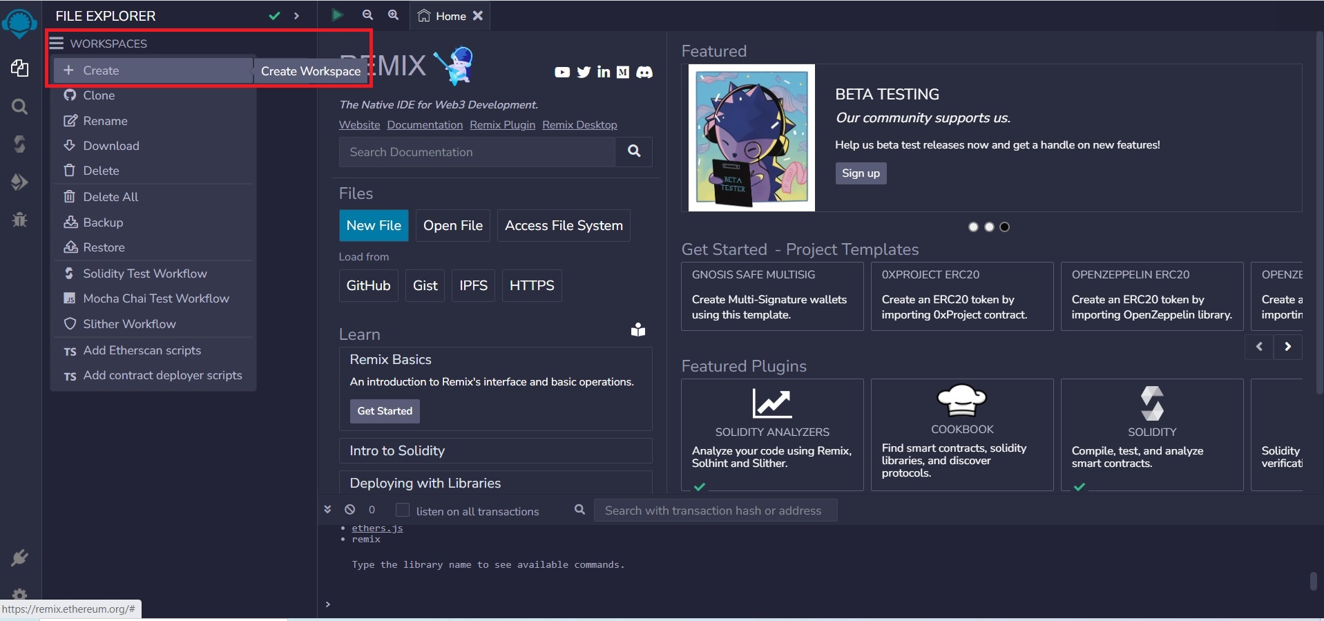 1. Open Remix IDE using the below link, <https://remix.ethereum.org/#lang=en&optimize=false&runs=200&evmVersion=null&version=soljson-v0.8.18+commit.87f61d96.js>. The default workspace looks similar like below,