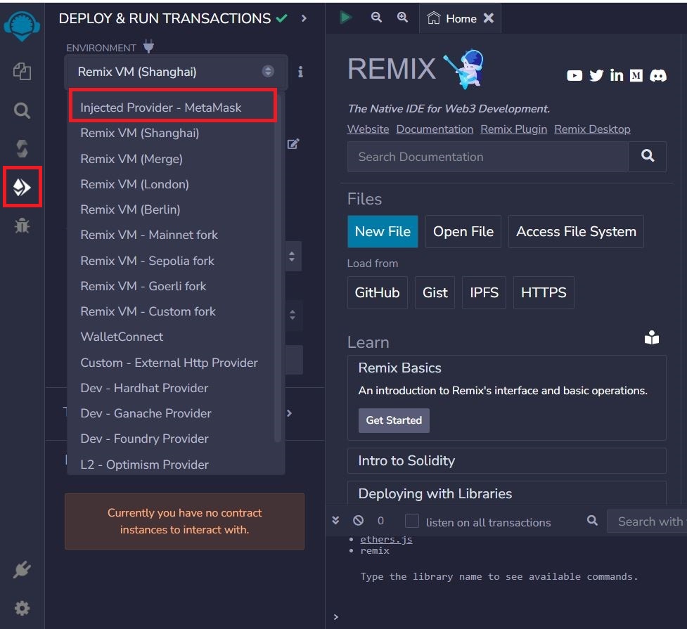 5. Choose **Deploy & Run Transactions** tab from the left pane of the workspace. To select the **Environment** option, click on the drop-down menu to choose **Injected provider - MetaMask.**
