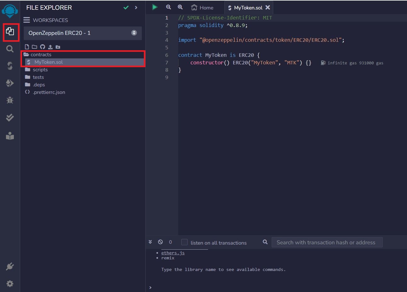 7. Switch to OpenZeppelin workspace to begin with the smart contract deployment. From the list of folders, select **contracts** and click on **MyToken.sol** which has the default configuration.