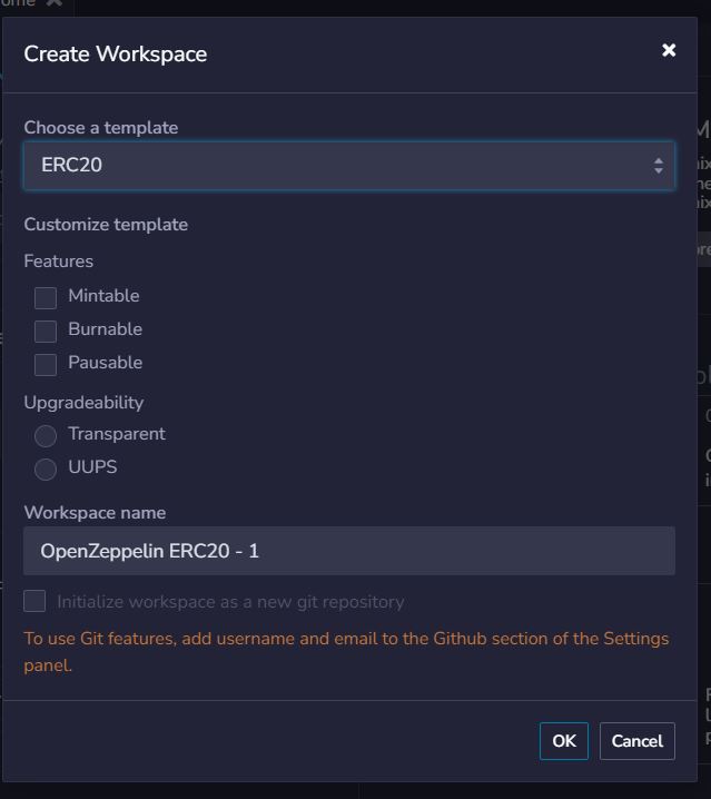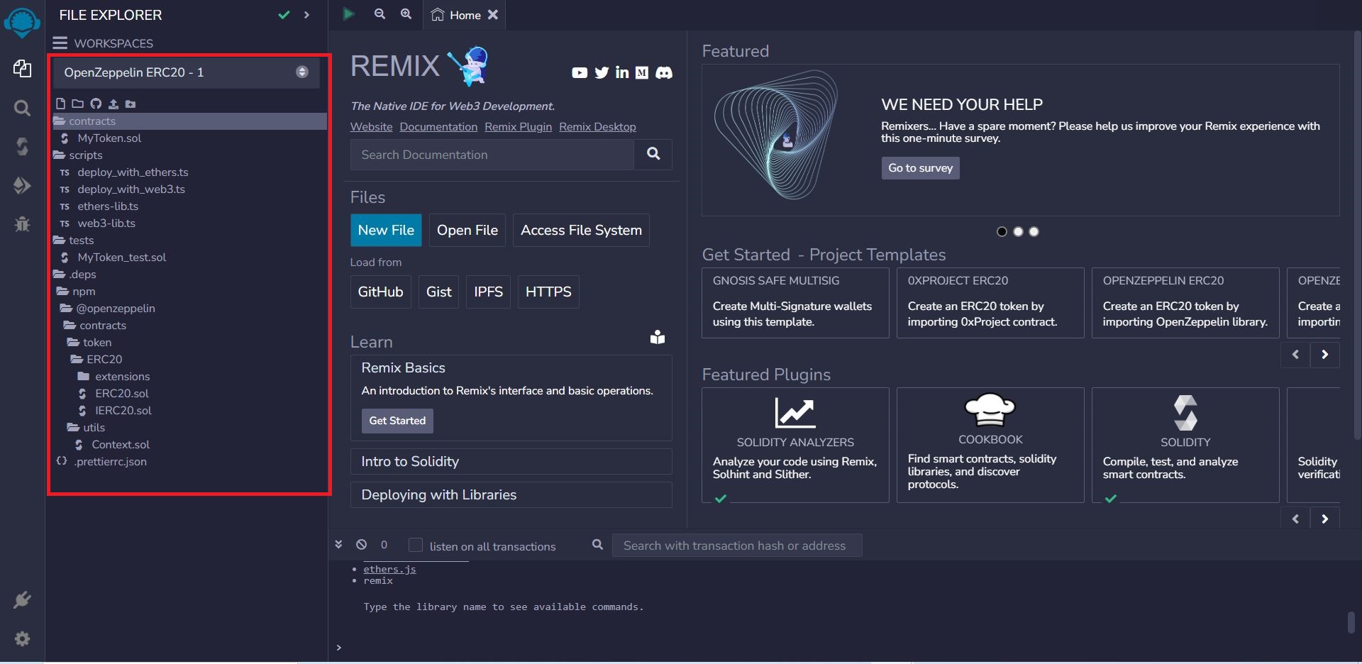 B) The new tab has various **Template** options to choose for the new workspace. The option selected here is **Open Zeppelin ->ERC20.** Open Zeppelin is the open source library/framework mainly used in the smart contract deployment for ethereum. It provides a set of audited and reusable contracts for the developers.